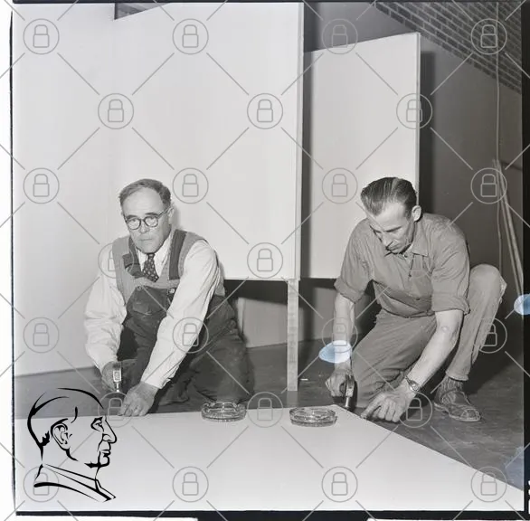 målning, hantverkare, svartvitt, arbete, verktyg, väggar, golv, renovering, bygg, män, 1900-tal, inomhus, professionell, färg, pensel, fokus, kreativitet, design, konst, traditionell, samarbete, stil, industriell, retro, handarbete, detaljer, arbetsmiljö, projekt, byggmaterial, ytor