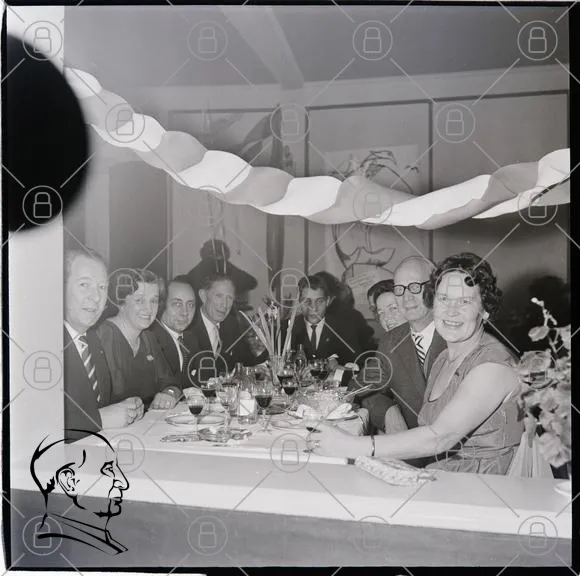middag, fest, sällskap, bord, glas, mat, dekoration, leenden, kläder, svartvitt, 1900-tal, samling, art deco, festligheter, män, kvinnor, samtal, feststämning, servett, vin, skratt, bakgrund, konstverk, tradition, socialt, gemenskap, elegans, stil, festkläder, nöje, minnen