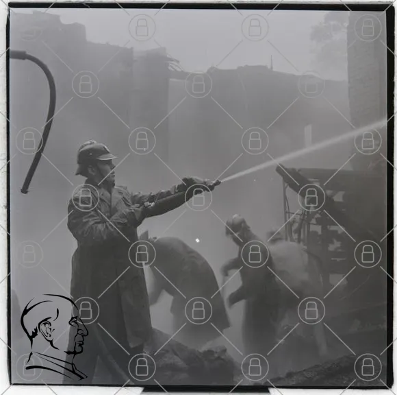 brandman, släckning, rök, vatten, brand, räddning, katastrof, säkerhet, utrustning, teamwork, historisk, svartvit, byggnad, brandstation, insats, hjälm, regnrock, brandfilt, brandbil, nödsituation, professionell, arbete, samhälle, risk, skydd, miljö, eldsflammor, brandrisk, insatsstyrka, brandbekämpning