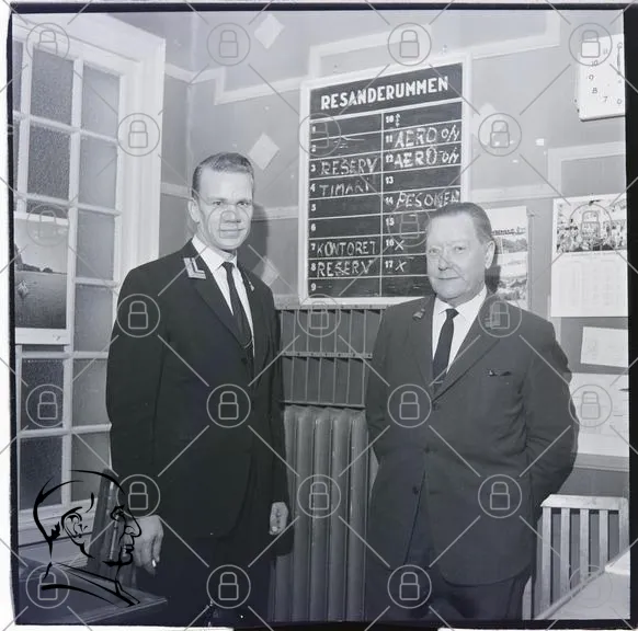 Resanderummet, män, kostymer, 1960-tal, svartvitt, kontor, reservation, personal, affisch, fönster, radiator, skrivbord, dokument, uniform, retro, fotografi, historia, Sverige, flyg, tjänst, professionell, stil, möte, affärsmän, tradition, kontorsmiljö, vintage, administration, service, kommunikation