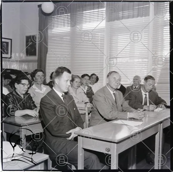 klassrum, möte, människor, 1950-tal, skrivbord, stolar, utbildning, föreläsning, svartvitt, kläder, ansikten, koncentration, lärande, diskussion, inomhus, fönster, belysning, dokument, anteckningar, grupp, traditionell
