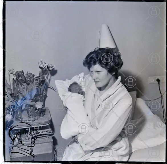 kvinna, baby, blommor, tulpaner, sjukhus, hem, morgonrock, leende, inomhus, familj, kärlek, nyfödd, vår, moder, omsorg, glas, bord, interiör, 1900-tal, svartvit, fotografi, nostalgi, mjuk, värme, trygghet, glädje