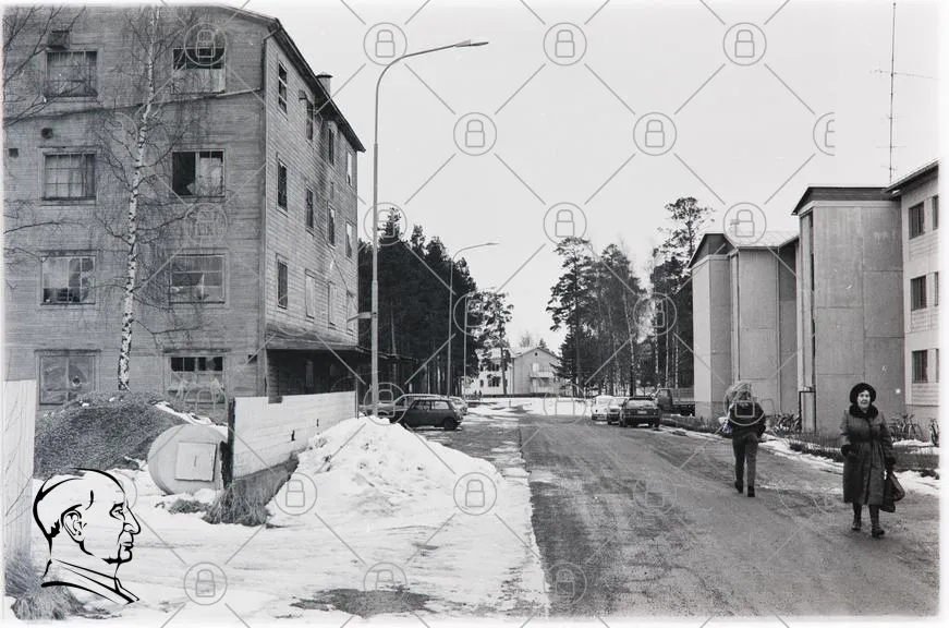 snö, gata, träd, byggnader, bil, lyktstolpe, vinter, person, hus, landskap, asfalt, gråskala, arkitektur, bostadsområde, natur, stillhet, urban, väg, fotgängare, gammal, modern, skog, radhus, snötäckt, miljö, utomhus, stadsmiljö, skandinavisk, tomt, lugn