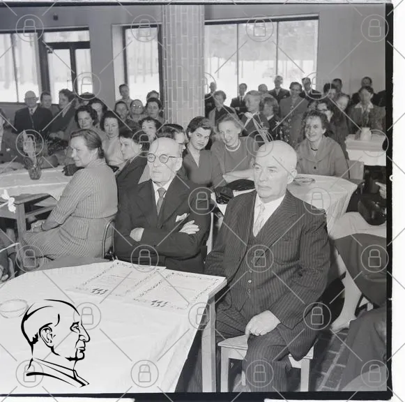 publik, evenemang, möte, kläder, 1950-tal, bord, stolar, män, kvinnor, samling, fest, inomhus, fönster, mat, dryck, ansikten, leenden, socialt, gemenskap, tradition, kultur, historia, svartvitt, fotografi, interiör, dekoration, samtal, uppvaktning, festligheter