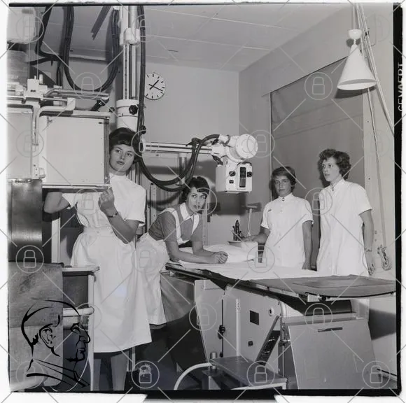 sjukhus, röntgen, sjuksköterskor, medicinsk utrustning, 1960-tal, vårdpersonal, röntgenmaskin, kläder, vit, kvinnliga, arbete, teknik, medicin, sjukhusmiljö, professionell, svartvitt, historia, hälsa, patienter, diagnos