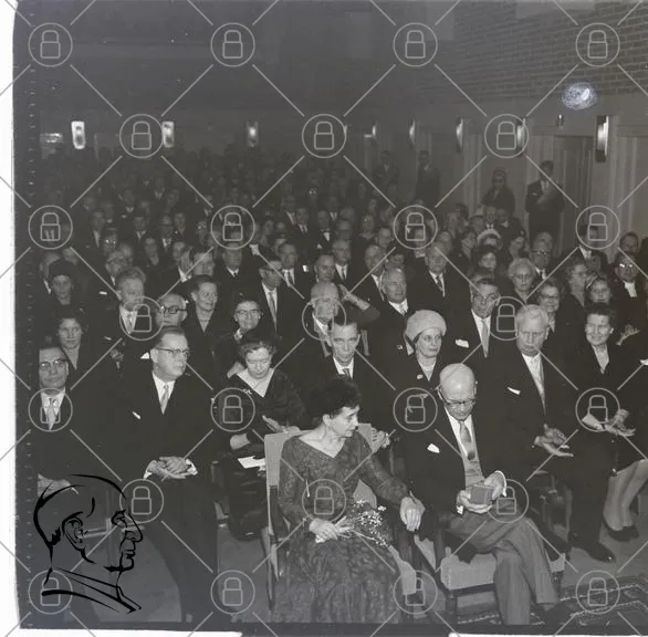 publik, evenemang, klädda, kostymer, kvinnor, män, sittande, formell, svartvitt, samling, åhörare, sal, ceremonin, blommor, klänningar, kostymer, eleganta, 1900-tal, historisk, tradition, festlig, uppvaktning, kultur, gemenskap, artister, talare, applåder, minnen, samarbete, dignitärer