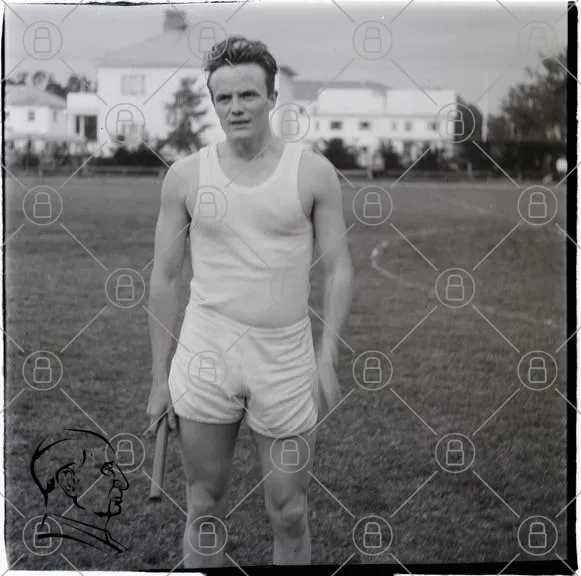 man, sport, atlet, löpning, tävling, stav, gräs, kläder, vit, 1900-tal, idrott, utomhus, träning, fokus, prestation, bakgrund, byggnader, stil, vintage, svartvit, hållning, muskulös, energi, ungdom, aktivitet, motion, tradition, sportkläder, tävlingsdräkt, handtag