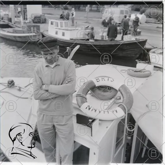 båt, hamn, man, livboj, vatten, last, arbete, kläder, svartvitt, båtar, kaj, transport, sjöfart, sommar, natur, stillhet, yrke, tradition, industri, landskap