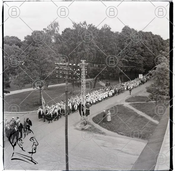 parad, procession, människor, uniformer, träd, park, väg, flaggor, högtid, samling, utomhus, svartvitt, historisk, evenemang, grupp, marsch, ceremoni, kläder, tradition, allvar, folkmassa, ledare, skyltar, stolpar, gräsmatta, gångväg, åskådare, sommar, skog, landskap