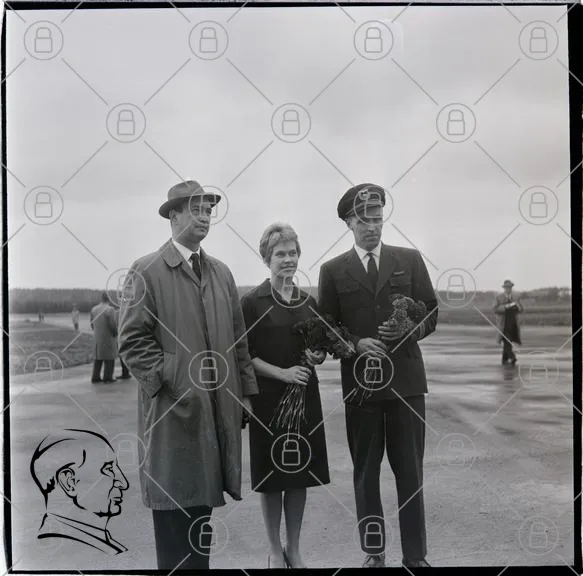 personer, blommor, flygplats, kostymer, hattar, 1960-tal, svartvitt, män, kvinna, uniform, fotografering, möte, stil, landskap, grå himmel, väder, socialt, samarbete, vänskap, tradition, historia