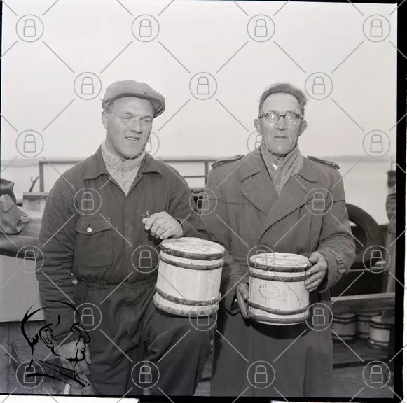 fiskare, män, fat, båt, kläder, svartvitt, arbete, tradition, hav, verktyg, samarbete, historia, porträtt, utomhus, landskap, gammal, industri, fiske, sjöfart, kultur, generationer, mänsklig aktivitet, natur, miljö, nostalgi, gemenskap, hantverk, yrke, fotografering