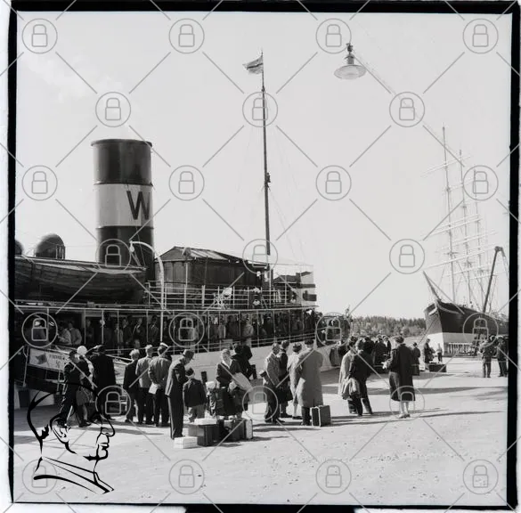 båt, ångbåt, hamn, passagerare, resande, väskor, 1900-tal, svartvit, skepp, kaj, flagga, rök, människor, transport, sjöfart, last, kläder, väntande, segelbåt, landskap, historia, tidigt, turister, avresa, ankomst, båtliv, hav, kajplats, station, båtläge