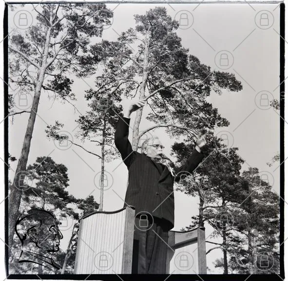 man, talare, utomhus, träd, himmel, kostym, predikstol, svartvit, gestikulerar, natur, skog, predikan, allvarlig, gammaldags, scen, högtidlig, publik, friluftsmöte, andakt, inspiration