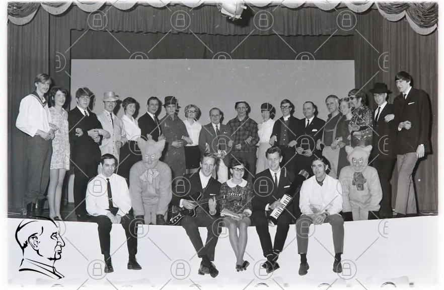 grupp, människor, kostymer, clown, musik, gitarr, klänning, hattar, svartvitt, scen, underhållning, 1960-tal, fest, leenden, fotografering, teater, skådespelare, masker, kostymdrama, publik, humor, tradition, samling, artister, föreställning, kreativitet, skratt, minnen, nostalgi, gemenskap