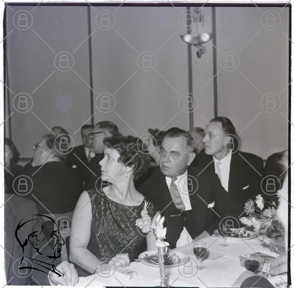 middag, fest, kläder, 1950-tal, svartvitt, bord, gäster, kvinna, man, dekoration, glas, servett, blommor, leende, samtal, eleganta, sällskap, ljus, mat, dryck, socialt, evenemang, stil, tradition, samling, uttryck, ansikten, bakgrund, interiör, festligheter