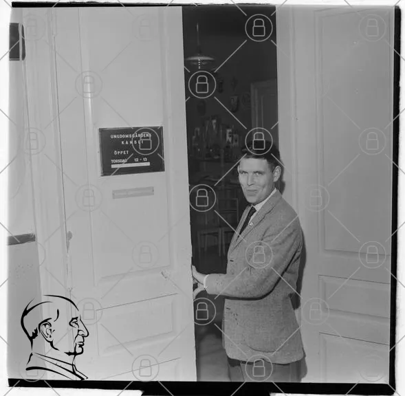 man, dörr, kontor, 1950-tal, svartvitt, skylt, ung, kläder, inomhus, möbler, interiör, ansiktsuttryck, entré, svensk, historisk, fotografi, gammal, stil, professionell, verksamhet, social, miljö, traditionell, kultur, arbetsplats, besökare, institution, vänster, öppning, rum