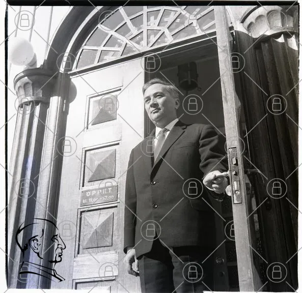 man, dörr, öppet, kostym, 1960-tal, svartvitt, entré, byggnad, leende, kavaj, skjorta, slips, fönster, arkitektur, offentlig, stil, professionell, besökare, välkomnande, traditionell, inredning, ljus, detaljer, trä, handtag, fotografi, porträtt, social, atmosfär, historisk