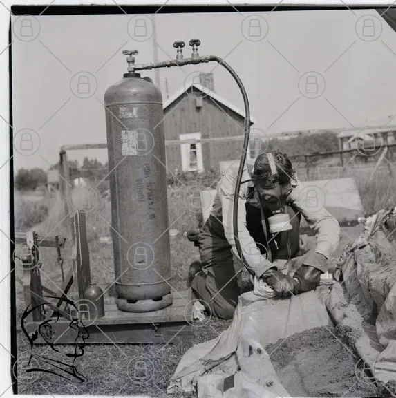 arbetsplats, gasflaska, skyddsmask, man, verktyg, byggmaterial, utomhus, industri, säkerhet, maskin, gammal teknik, svartvitt, hantverk, arbete, konstruktion, laboratorium, experiment, utrustning, handskar, skydd, miljö, forskning, traditionell, ingenjör, arbete med händerna, professionell, historisk, teknik, maskinvara