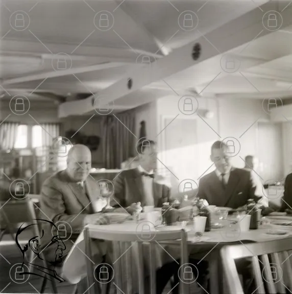 middag, män, kostymer, bord, drycker, mat, inomhus, 1950-tal, svartvitt, restaurang, samtal, sällskap, stolar, fönster, dukat bord