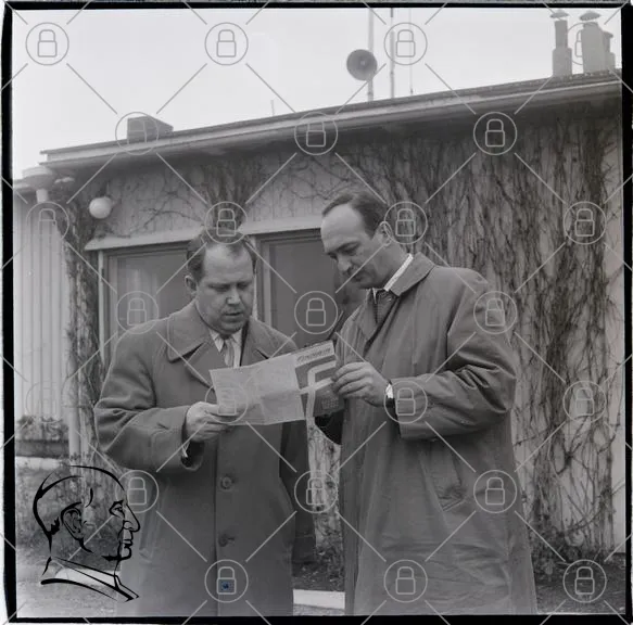 två män, diskussion, papper, byggnad, trädgård, kläder, kostymer, överrockar, svartvitt, 1960-tal, utomhus, kommunikation, planering, dokument, ansiktsuttryck, samarbete, professionellt, kontor, teknik, telefonmast