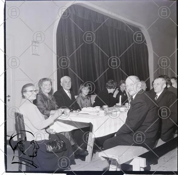 middag, fest, sällskap, bord, dukat, ljus, kläder, äldre, människor, leenden, samtal, tradition, samvaro, fotografi, svartvitt, inomhus, bänk, mat, dryck, familj, vänskap, gemenskap, 1900-tal, högtid, festligheter, socialt, kultur, minnen, historia