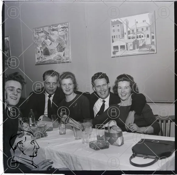 middag, fest, människor, leende, bord, glas, flaskor, kläder, svartvitt, konst, vägg, porträtt, samvaro, 1950-tal, socialt, nöje, skratt, vänner, sällskap, fotografi, tradition, interiör, gemenskap, minnen, festligheter, ungdomar, familj, glädje, samling, retro
