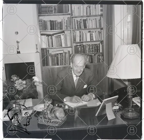man, skrivbord, böcker, lampa, skrivande, kontor, blommor, skulptur, svartvitt, dokument, penna, glas, telefon, inredning, fönster, tidning, porträtt, gammal, klassisk, stil, möbler, arbetsplats, akademisk, intellektuell, fokus, kreativitet, litteratur, kontorsmaterial, heminredning, traditionell