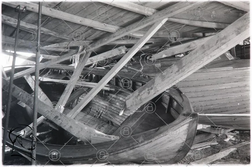 båt, trä, byggnad, tak, brädor, inredning, gammal, verkstad, reparation, skador, struktur, hantverk, marin, förvaring, verktyg, båtbyggeri, insida, mörk, skugga, detaljer, hantverkskonst
