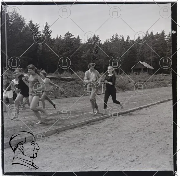 barn, löpning, strand, skog, sommar, aktivitet, sport, badkläder, pojkar, flickor, natur, lek, utomhus, träning, gemenskap, minnen, svartvitt, historisk, ungdomar, glädje, motion, fritid, landskap, stuga, väg, sand, skratt, vänskap, energi, rörelse