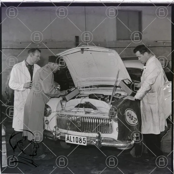 bil, mekaniker, verkstad, motor, reparation, 1950-tal, män, arbetskläder, verktyg, gammal bil, teknik, underhåll, mekanisk, arbete, motorhuv, OSS, AL1085, svartvitt, retro, industri, fordon, professionell, teamwork, service, tradition, historia, detaljer, bilservice, mekanisk arbete, bilreparation