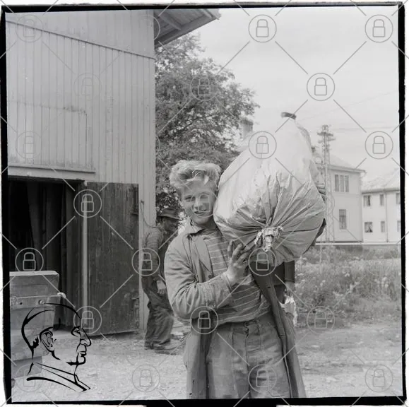 pojke, säck, arbete, gård, byggnad, sommar, landsbygd, leende, kläder, trä, natur, bakgrund, historia, svartvit, ungdom, utomhus, lasta, jordbruk, tradition, gemenskap, aktivitet, barn, skörda, landskap, fotografi, 1900-tal, kultur, nostalgi, enkelhet