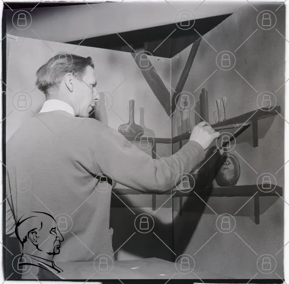 man, målning, konst, skåp, hylla, flaskor, keramik, pensel, svartvitt, inomhus, kreativitet, hantverk, detaljer, belysning, konstverk, retro, 1900-tal, stillhet, fokus, handarbete, konstnär, skapande, design, estetik, tradition, kultur, inspiration, uttryck, konstnärlig