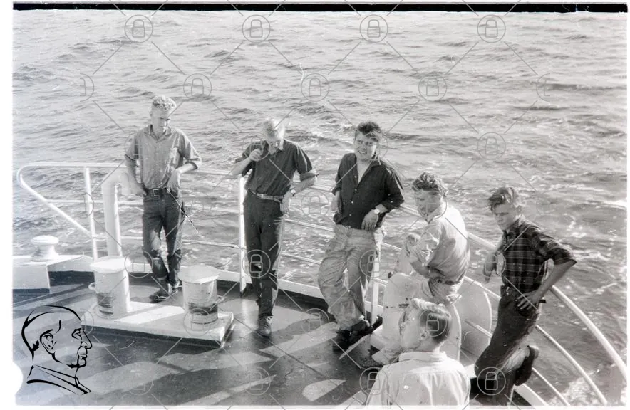 män, båt, hav, svartvit, 1950-tal, sjömän, kläder, leende, grupp, fotografi, marin, arbete, tradition, historia, resor, vänner, samarbete, natur, vatten, däck, segling