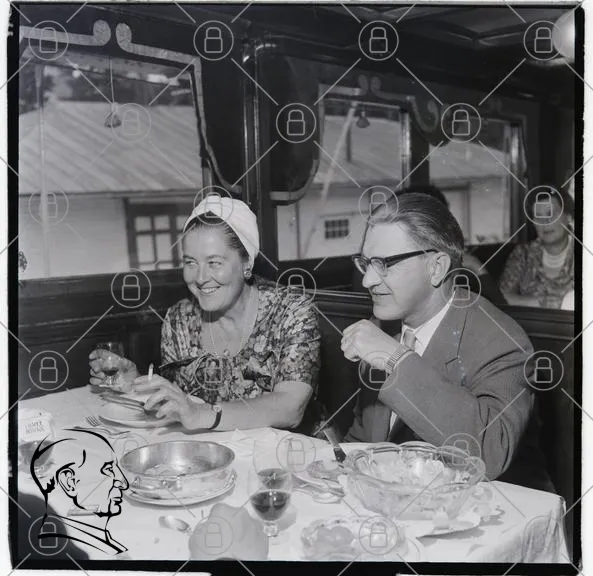 middag, restaurang, 1950-tal, par, mat, dryck, leende, kläder, bord, glas, skål, inredning, svartvitt, socialt, samtal, fest, tradition, atmosfär, nöje, gemenskap, äldre, kvinnor, män, servett, tallrik, bestick, fönster, bakgrund, interiör, stil
