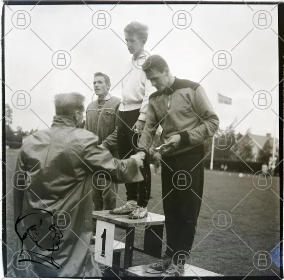 tävling, idrott, medalj, prisutdelning, sport, män, podium, handskakning, kläder, gräs, flagga, 1960-tal, prestation, glädje, gemenskap, utmärkelse, träning, ungdomar, tradition, evenemang