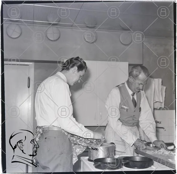 kök, män, matlagning, svartvitt, förkläden, kastruller, bänkskiva, köksutrustning, 1950-tal, samarbete, recept, professionella, kläder, inomhus, köksmiljö, redskap, arbete, mat, tradition, stil