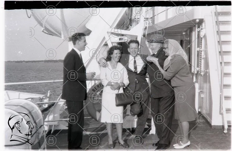 personer, skratt, båt, kläder, 1950-tal, svartvitt, glädje, samvaro, hav, semester, vänner, leenden, fotografi, minnen, resor, socialt, nöje, familj, tradition, stil, interaktion