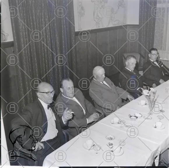 möte, män, kostymer, slipsar, bord, kaffe, glas, duk, väggmålningar, inomhus, 1950-tal, diskussion, affärsmän, formell, samling, stolar, blommor, samtal, professionell, vintage, svartvitt, interiör, socialt, traditionellt, eleganta, uttryck, gestikulationer, kläder, atmosfär