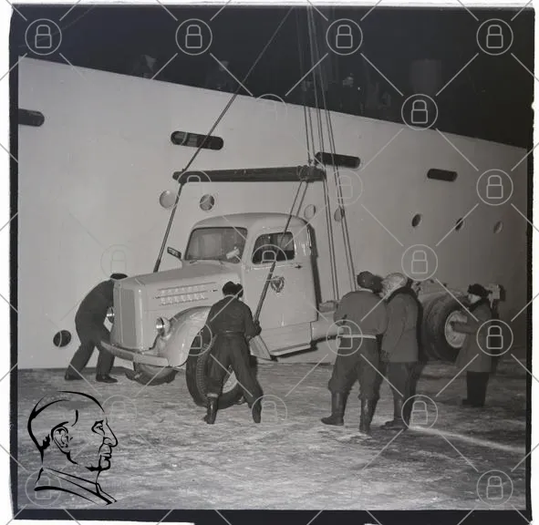 lastbil, kran, fartyg, hamn, natt, arbetare, lyft, transport, sjöfart, vinter, is, snö, arbetskläder, fordon, skepp, hamnarbete, lyftanordning, sjötransport, hamnkran, lastning, sjöfartstransport, hamnverksamhet, skeppsdäck, sjöman, hamnlogistik