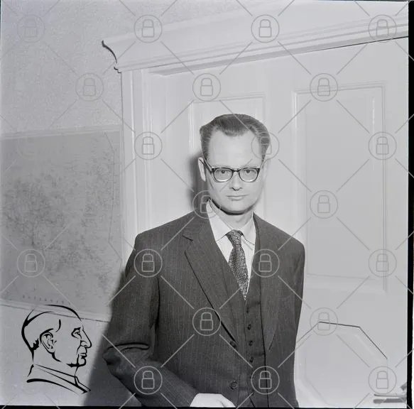 man, kostym, glasögon, svartvitt, porträtt, 1960-tal, kontor, dörr, vägg, karta, formell, affärsmann, kläder, stil, professionell, inomhus, uttryck, fotografi, retro, vintage, manlig, intellektuell, seriös, pose, detaljer, ansikte, hår, skägglös, kavaj, slips
