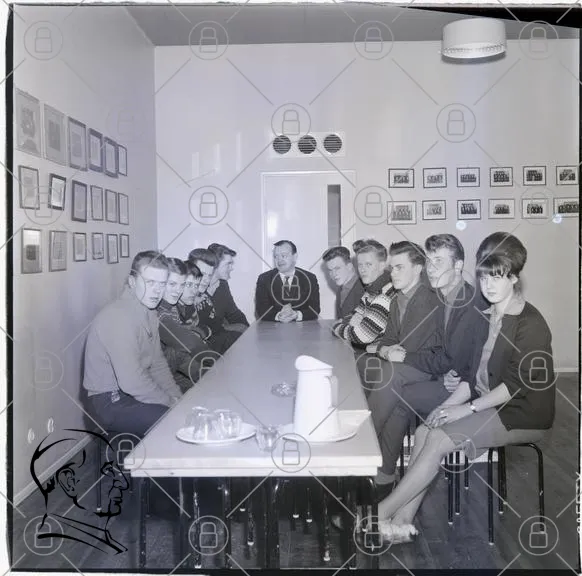 möte, bord, stolar, personer, svartvitt, väggar, fotografi, kläder, inomhus, diskussion, 1960-tal, ungdomar, man, kvinna, glas, kanna, dokument, ram, konst, grupp, interiör, stil, ansikten, uttryck, samling, presentation, utbildning, socialt, atmosfär, tradition