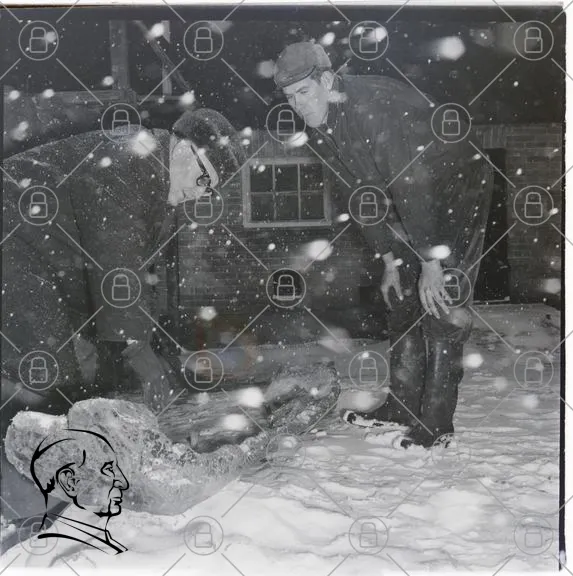 snö, män, arbete, staty, vinter, utomhus, byggnad, gammal, fotografi, historia, landskap, föremål, grå, kläder, snöfall, mark, detaljer, tradition, kultur, forskning, upptäckter, arkeologi, vetenskap, mänsklig aktivitet, samarbete, natur, miljö, tid