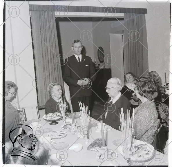 middag, sällskap, äldre, man, kvinna, barn, bord, mat, ljus, samtal, kläder, 1950-tal, fest, tradition, familj, samling, inomhus, svartvitt, fotografi, socialt, gemenskap, dekoration, tallrikar, skålar, servetter, stolar, väggar, fönster, interiör, högtid
