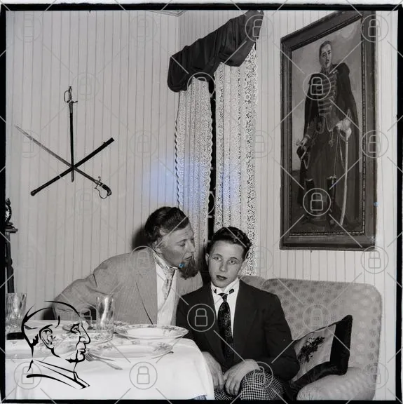 middag, par, restaurang, tavla, svärd, fönster, gardiner, kostym, slips, duk, glas, tallrikar, porträtt, inredning, väggdekoration, matbord, stolar, man, kvinna, interiör