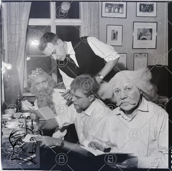 man, skägg, kostym, peruk, smink, skrivande, bord, fönster, dokument, vintage, svartvitt, teater, rekvisita, kläder, 1900-tal, män, porträtt, kreativitet, underhållning, scen, konst, tradition, humor, grupp, interiör, gammal, fotografi, fest, karaktärer, skådespelare