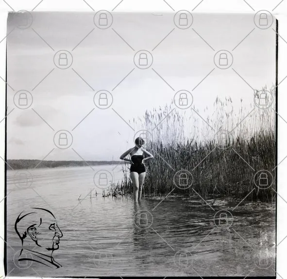 sjö, kvinna, vass, vatten, strand, sommar, badkläder, natur, landskap, himmel, moln, reflektion, svartvitt, stillhet, ensamhet