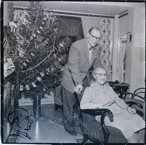julgran, äldre par, inomhus, svartvitt, möbler, juldekorationer, stolar, hem, tradition, familj, 1900-tal, festligheter, kläder, glasögon, leende, julkort, väggdekorationer, rug, sällskap, nostalgisk, interiör