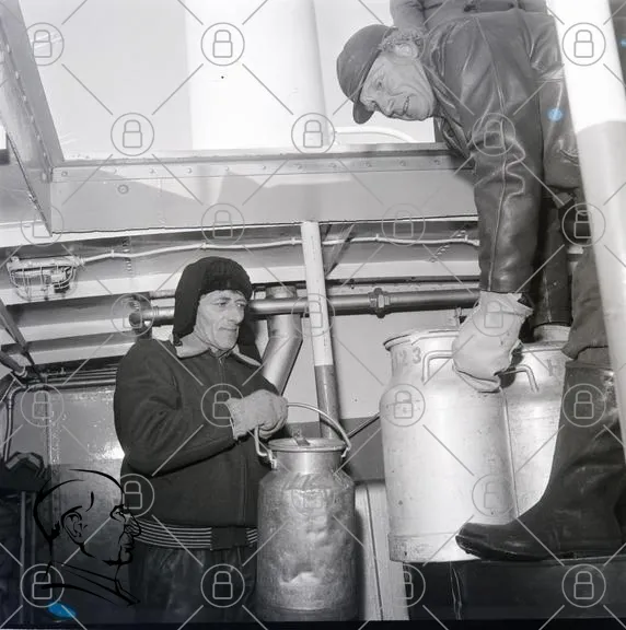 mjölk, män, arbete, behållare, båt, industri, 1950-tal, svartvitt, fiske, tradition, hantverk, mjölkproduktion, kläder, maskiner, miljö, samarbete, lasta, avlastning, marin, jordbruk, historia, mänsklig aktivitet, arbetsliv, hantverksarbete, mjölkkruka, sjöfart, arbetskläder, teamwork, produktion, hav