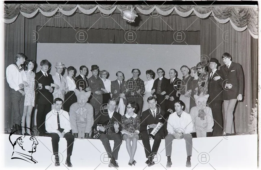 teater, skådespelare, kostymer, scen, svartvitt, musik, instrument, publik, 1960-tal, gruppfoto, underhållning, kläder, leenden, föreställning, komedi, drama, tradition, kultur, samarbete, artister, rekvisita, ljus, bakgrund, uttryck, gemenskap, minnen, nostalgisk, evenemang, fest, presentation