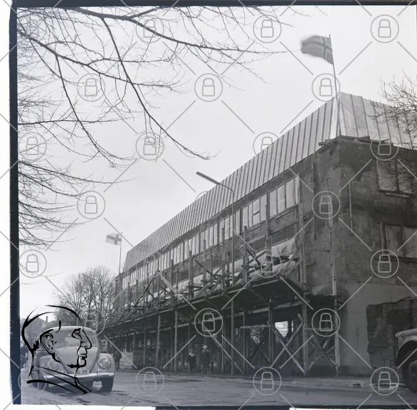 byggnad, renovering, byggställningar, träd, bil, svartvit, fasad, fönster, flagga, gata, arkitektur, 1900-tal, stadsmiljö, konstruktion, historisk, transport, landskap, urban, detaljer, skydd, arbete, industri, gammal, modernisering, perspektiv, foton, fotografering, utomhus, miljö, kultur